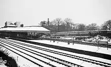 The station was the first to arrive in the town, being built by the Manchester and Leeds Railway and opened in 1840.[1] It was built on the main line and had the status of such, not least because of its substantial adjacent goods-handling facility, but within ten years of having been built, its importance was somewhat reduced by the arrival of town centre competition. Its lower volume of business naturally contributed to its lower status generally. It was often confused with other Dewsbury stations, or entirely disregarded. It closed just three years prior to Beeching's closure of Dewsbury central, on the last day of 1961.