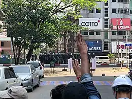 The salute became a symbol of opposition to the 2021 Myanmar coup d'état and subsequent civil war.[11] The movement was launched on social media, and many Myanmar celebrities such as Paing Takhon and Dave Leduc have joined the movement.[12][13]