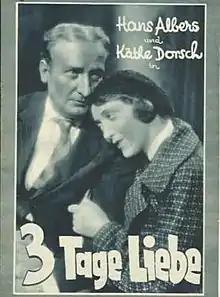 Three Days of Love (German: Drei Tage Liebe) is a 1931 German drama film directed by Heinz Hilpert and starring Hans Albers, Käthe Dorsch, and Trude Berliner.[1] It was made and distributed by the independent Felsom Film company. It was shot at the Tempelhof Studios in Berlin. The film's sets were designed by the art director Hans Jacoby.