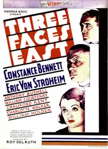 Three Faces East is a 1930 American Pre-Code film directed by Roy Del Ruth and starring Constance Bennett and Erich von Stroheim. Produced by Daryl Zanuck and released by Warner Brothers it is based on a 1918 Broadway play about World War I spies, Three Faces East, by Anthony Paul Kelly.[1] It was filmed as a silent in 1926.[2] A later remake in 1940 starred Boris Karloff and Margaret Lindsay was titled British Intelligence.