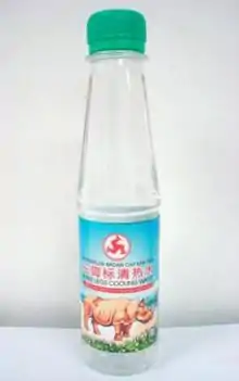 The earliest and original bottle of Three Legs Cooling Water features the image of a rhinoceros on its label. According to the company, although the drink comprises Chinese herbs and does not contain any ingredients from the animal, the company picked a rhinoceros as its icon because the horn of rhinoceros was traditionally associated with 'cooling' properties in Chinese propriety medicine.[6] Between the 1950s and 1990s, Three Legs Cooling Water was sold in Singapore, Malaysia and Indonesia featuring a rhinoceros on its product label.