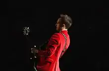 Vukašin Brajić took part in technical rehearsals on 16 and 20 May,[13][26] followed by dress rehearsals on 24 and 25 May.[27] The Bosnian performance featured Brajić in a red jacket, t-shirt and jeans, joined on stage by five backing vocalists.[28] During the performance, he dropped his electric guitar to the floor which he originally wore around his shoulder. The stage lighting displayed white and blue colours with strobe lighting featured throughout the performance. The performance also featured smoke effects and the use of a wind machine.[13][26][29] The five backing vocalists that joined Brajić were: Danijela Večerinović, Dunja Galineo Kajević, Edvin Hadžić, Elma Selimović and Marko Vulinović.[30]