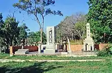 At the northeast end of the reserve, on the flat land beside Aplin Road, is the Japanese pearl-shell divers' burial ground (Area A). This area is reasonably well maintained. Most of the graves in this section have raised mounds covered with stone, concrete, or a combination of both. Many are marked with granite or concrete columns, usually consisting of three sections, and a few have European-style marble and concrete headstones. Graves without such markers are marked either with wooden posts painted white with Japanese characters lettered in black; or with unpainted timber posts with engraved inscriptions of Japanese characters. A few graves remain as mounds but are otherwise unmarked. On some of the Japanese graves are small concrete birdcages, housing food for the spirits of the departed divers, and on some graves, frangipani (Plumeria rubra) have been planted. The majority of graves in this area contain a metal cemetery grave marker.[1]