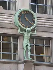 The statue is of a bearded, thin man, wearing nothing except a crossed leather strap. The figure stands upright, unbent from how it appears to hold the large clock above it. His left foot is placed in front of him, partially off the statue's base. The work is a realistic impression of the human form. It was sculpted from wood of a fir tree, painted to resemble the patina of weathered bronze; the feet are made of solid lead.[14] Tiffany & Co. has released products based on the statue's design, and has created replicas for its stores in other locations across the country.[15]