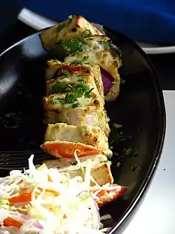 Tikka consists of boneless pieces of meat or vegetarian alternatives such as paneer, which are marinated in spices and yogurt and subsequently strung through a skewer to be cooked.[3] It is generally cooked in a tandoor and served dry.[3]