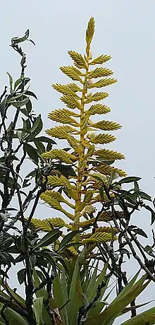 Tillandsia oerstediana is an evergreen plant with grey-green leaves arranged in a rosette up to 40 cm across. When in bloom, it has a golden coloured flowerspike of waxy yellow bracts with tiny, tubular pink flowers.[3]