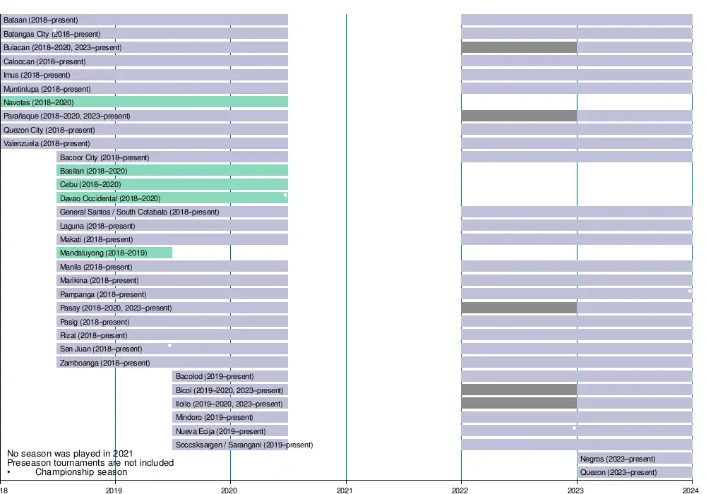 Two expansion teams joined the league: Negros Muscovados and Quezon Huskers. Five teams also made their return: Bulacan Kuyas, Bicol Volcanoes, Iloilo United Royals, Parañaque Patriots, and Pasay Voyagers.[3]