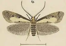 ♂. 18 mm. Head pale ochreous. Palpi pale ochreous, fuscous beneath, except at base and apex of second segment. Antennae dark fuscous, ciliations in whorls at joints, 4. Thorax dark ochreous, shoulder bronzy-brown. Abdomen bronzy-fuscous, segmental divisions leaden-white. Legs ochreous, more or less infuscated, anterior pair dark brown above. Forewings elongate, costa strongly arched, apex broadly rounded, termen rounded, very oblique; bronzy-brown, more ochreous apically; a broad ochrcous-white stripe from base to tornus with a black spot resting on its lower edge at ½; a blackish spot above this in the dark costal area; a rather large black discal spot at ⅔: fringes dull-brownish. Hindwings dark fuscous: fringes fuscous with darker basal line.[3]