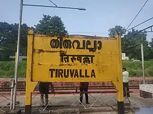 Tiruvalla railway station (station code : TRVL) is a railway station.[2] It is one of the busiest railway station in Thiruvananthapuram Central-Kollam-Kottayam-Ernakulam route, located at Thiruvalla town in Pathanamthitta district, Kerala, India. Tiruvalla is the only railway station in the Pathanamthitta District. The station is under Thiruvananthapuram railway division of Southern Railway. It is an NSG 4 category station and has daily trains to cities like Thiruvananthapuram, Kochi, Kozhikode, Mangalore, Bangalore, Coimbatore, Madurai, Chennai, Hyderabad, Tirupati, Pune, Bhopal, Mumbai and New Delhi.