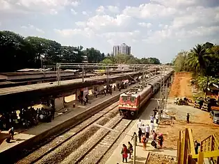 Tiruvalla railway station has three platforms and five tracks. The railway station is one of the busy railway stations of Kerala, with about 6,000 passengers boarding trains on a daily basis, and generated an annual income of 18.82 crore (US$2.4 million) in the year 2016–17.[2] Both long and short-distance trains stop at Tiruvalla, and at present the station is a way-side station, though terminal facilities could be developed. The Tiruvalla station lies in the Kayankulam Junction–Kottayam–Ernakulam route, and along with the nearby Chengannur railway station, is an important station en route.