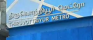 Thiruvottriyur is an elevated metro station on the North-South Corridor of the Line 1 Extension of the Blue Line of Chennai Metro in Chennai, India. This station will serve the neighbourhoods of Thiruvottriyur and other northern suburbs of Chennai.