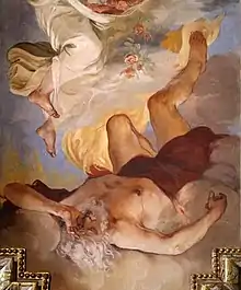 The poem's common name comes from the Greek myth of Tithonus, which is mentioned in lines 9 to 12. According to legend Tithonus was a Trojan prince, loved by Eos, the goddess Dawn. She asked that Zeus make her lover immortal; he granted the request, but as she did not ask for eternal youth for Tithonus, he continued to age for eternity. The story of Tithonus was popular in archaic Greek poetry, though the reference to him in this poem seems out of place, according to Rawles.[14] However, Page duBois notes that the use of a mythical exemplum to illustrate the point of a poem, such as the story of Tithonus in this poem, is a characteristic feature of Sappho's poetry – duBois compares it to Sappho's use of the story of Helen in fragment 16.[15] Martin Litchfield West considers that these lines seem like a weak ending to the poem, though Tithonus functions as a parallel to Sappho in her old age.[16]