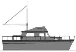 The yacht has a glass-reinforced plastic hull, and glass superstructure, its painted white with blue stripes in the upper parts of the hull and superstructure.[4] It also has a very shallow draught, and is prone to rolling, its therefore only used in coastal waters. Despite its small size, it can carry a crew of up to four, a captain, helmsman, engineer, and steward. Its equipped with a separate two berth cabin in the bow, as well as a wardroom with a dining area that can be transformed into two extra beds.