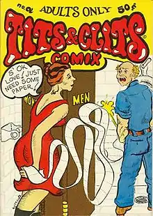 The first issue of Tits & Clits sold out of its first printing of 20,000 copies by the next year. Because the series' title limited its exposure, the second issue appeared in 1973 under the title Pandoras Box Comix (sic - apostrophe omitted). Condemned by many feminists (even other cartoonists), as well as the expected antagonism from male underground cartoonists,[2] Tits & Clits also suffered from a 1973 pornography investigation by the Orange County, California, district attorney's office.[4][5][6]