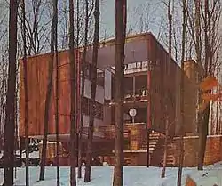 The Balogh House is set back from the road on a heavily wooded lot along a dirt road.[3] The house is a two-story cubic structure, roughly square in plan,[3] and clad in redwood siding. The house sits on a partial basement on one side and support posts on the other side. The section beneath the house was originally open, and used for parking; the space beneath gives the house an impressive "lightness" and makes it appear to hover above the landscape. The dramaticness of the house has been reduced due to the infilling of the underneath to create a new room.[2]