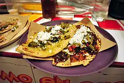 A tlacoyo [tɬaˈkoʝo] is a Mexican dish of pre-Hispanic origin made of masa. Tlacoyos are thicker than fresh corn tortillas and are stuffed with cheese, fava beans, cooked ground beans, chicharron, and other ingredients before being fried or toasted. Tlacoyos can be served as an accompaniment to soups and stews or as appetizers for celebrations. They are made in varying shapes, most being oval and some also triangular.