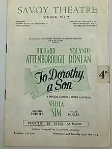 To Dorothy, a Son is a 1950 comedy play by the British writer Roger MacDougall. The plot revolves around a complex inheritance in which the American ex-wife of a man tries to prevent his current pregnant wife giving birth before a certain day, in order that she can claim the money.