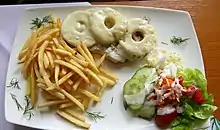 Toast Hawaii or Hawaiian Toast is an open sandwich consisting of a slice of toast with ham and cheese, and a maraschino cherry in the middle of a pineapple slice, broiled, so that the cheese starts to melt.[1] It was made popular by the West German TV cook Clemens Wilmenrod in the 1950s. It is likely that it was adapted from the "Grilled Spamwich", a recipe published in a Spam cookbook by Hormel in 1939[2] and brought to West Germany by American G.I.s. Spam was not available in Germany's grocery stores so Wilmenrod replaced it with a slice of cooked ham.[3]