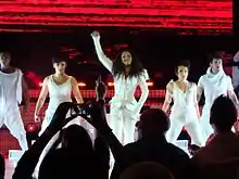 In 2004, while promoting her eighth studio album, Damita Jo, Jackson made surprise performances of "Together Again" and "All Nite (Don't Stop)" at New York's Gay Pride March.[57] "Together Again" was one of her older songs on the 2008 Rock Witchu Tour, her first tour in seven years. It was at the middle of the setlist.[58] She was dressed in a gold and black glam hip hop-inspired track suit, and one gold glove.[59] Variety magazine's Phil Gallo likened her vocals in the song to that of Diana Ross's.[60] Rap-Up noted the audience "went wild" during the song.[61] While reviewing the Vancouver concert, Marsha Lederman of The Globe and Mail noted that the most memorable moment of the show was when Jackson "stopped on the catwalk after her hit Together Again, listened to the crowd roar its approval, and became emotional – really emotional. We're talking tears. 'Thank you,' she said – seeming to really mean it, as she waved her hands, begging the audience to stop", she completed.[59] While promoting her second greatest hits album, Number Ones, the singer performed an eight-minute medley of six hits during the American Music Awards of 2009. It included "Control", "Miss You Much", "What Have You Done for Me Lately", "If", "Make Me", and finished with "Together Again". For the latter's performance, Jackson stood alone at center stage, smiling, as the received applauses and standing ovation from the audience.[62][63] It also was the closing song of her concert at Essence Music Festival in New Orleans, in July 2010, which she headlined.[64] "Together Again" was again performed as a closing number on her Number Ones: Up Close and Personal 2011 tour as a dedication to her late brother, Michael Jackson, wearing a tight white one-piece disco suit. MTV News' writer Vaughn Schoonmaker noted that the song appeared to be the biggest hit of the show.[65] Writing for the Hartford Courant, Thomas Kintner pointed out that "A finale of 'Together Again', offered as a simple tribute that recalled her brother again, proved the evening's highlight, a relaxed trip through the sort of juicy pop Jackson has stockpiled throughout her career, and which still charms when she lets it run".[66] Jackson also included the song on her 2015-16 Unbreakable World Tour. The song is also included on the 2017-2019 State of the World Tour. Jackson also included the song on her 2019 Las Vegas Residency Janet Jackson: Metamorphosis. Jackson later named her 2023 tour after the song, and performed it in multiple versions throughout the show: The DJ Premier 50 to 100 remix at the beginning of the show, the Deeper remix at the middle, and, as the encore, the album version.[67]
