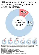 - In a survey conducted by home renovation company SunRefreHoldings in 2013, out of 2,459 valid responses, 12% had eaten in a public restroom at home, school, or work. Of these same responses, 19% said they had eaten toilet meals in their 20s, 13% in their 30s, and 11% in their teens. Notably, 80% of women in their twenties stated they had eaten a "toilet meal", many of them in public restrooms.[11][2]