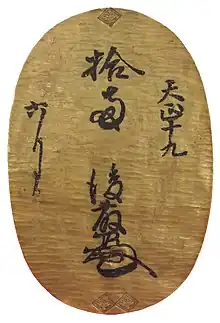 In 1835 the Tokugawa government started minting copper 100 mon named Tenpō Tsūhō (Kyūjitai: 天保通寶 ; Shinjitai: 天保通宝) as a way to solve its budgetary deficit, as the coin contained only 5½ as much copper as a 1 mon Kan'ei tsūhō this eventually lead to inflation.[7][8] This was later followed by the Satsuma Domain issuing a 100 mon coin of their own in 1862 to supposedly produce currency for the Ryukyu Kingdom, while in reality doing it to boost their own economy. These Ryūkyū Tsūhō (琉球通寳) coins eventually started circulating in other provinces as well.[9][10][11]