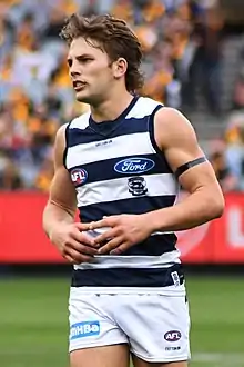 Atkins was selected by Geelong with pick 11 in the 2019 AFL rookie draft and cited as "another graduate of the Geelong VFL production line" alongside other AFL-listed players such as Tom Stewart, Scott Thompson and Shane Mumford. He anticipated playing primarily as a small forward rather than an inside midfielder as he had done in the VFL, due to Geelong's abundance of high-quality midfielders.[8] Atkins made his debut in the opening round of the 2019 season against Collingwood at the Melbourne Cricket Ground.[12]