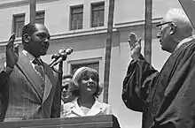 Bradley sworn in as Mayor by former Chief Justice Earl Warren, 1973.