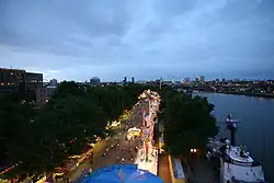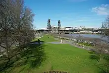 Governor Tom McCall Waterfront Park is a 36.59-acre (148,100 m2) park located in downtown Portland, Oregon, along the Willamette River. After the 1974 removal of Harbor Drive, a major milestone in the freeway removal movement, the park was opened to the public in 1978. The park covers 13 tax lots and is owned by the City of Portland (Portland Parks and Recreation).[1] The park was renamed in 1984 to honor Tom McCall, the Oregon governor who pledged his support for the beautification of the west bank of the Willamette River—harkening back to the City Beautiful plans at the turn of the century which envisioned parks and greenways along the river.[2] The park is bordered by RiverPlace to the south, the Steel Bridge to the north, Naito Parkway to the west, and Willamette River to the east. In October 2012, Waterfront Park was voted one of America's ten greatest public spaces by the American Planning Association.[3]