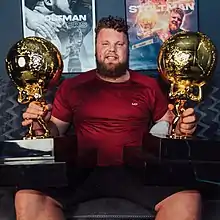 Tom Stoltman (born 30 May 1994) is a British professional strongman competitor, from Invergordon, Scotland. He was the winner of the World's Strongest Man title two consecutive times in 2021 and 2022. He also won the national title Britain's Strongest Man on the same years. Nicknamed "The Albatross" due to his sizeable arm span, Stoltman is known for his prowess with the Atlas Stones. In 2020, Stoltman broke the world record for the 5 Atlas Stones (light set) 100–180 kilograms (220–397 lb) in just 16.01 seconds; he also holds the world record for the heaviest Atlas stone ever lifted over a 4 ft bar at 286 kilograms (631 lb).[2][3]