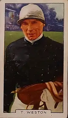 ![]() Tommy Weston, in the colours of Lord Derby (Gallaher's cigarette card, 1936) | |