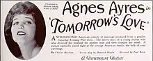 Tomorrow's Love is a 1925 American silent comedy film directed by Paul Bern, written by Charles Brackett and Howard Higgin, and starring Agnes Ayres. Pat O'Malley, Raymond Hatton, Jane Winton, Ruby Lafayette, and Dale Fuller. It was released on January 5, 1925, by Paramount Pictures.[1][2][3]
