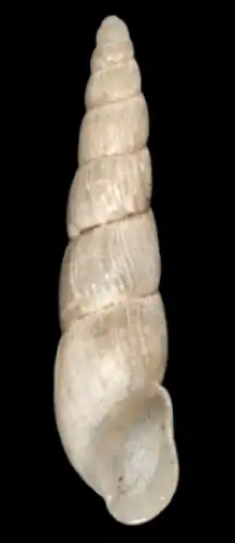| A shell of Tomostele musaecola. The height of the shell is 8.71 mm. | |