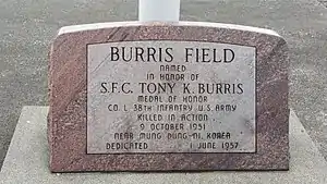 Tony Kenneth Burris (May 30, 1929 – October 9, 1951) was a Choctaw soldier in the United States Army during the Korean War.[1] He posthumously received the Medal of Honor for his actions on October 8–9, 1951, during the Battle of Heartbreak Ridge.