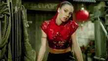 A scene from the music video, featuring Chisholm dressed in a red cheongsam, in a segment based on the film Year of the Dragon