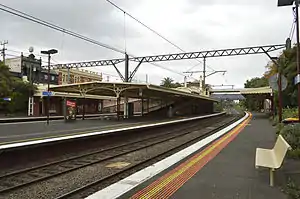 The station consists of a single island platform and two side platforms with a total of four platform edges. Standard in Melbourne, the platform has an asphalt surface with concrete on the edges. The platforms are approximately 160 metres (524.93 ft) long, enough for a Metro Trains 7 car HCMT.[4] The station features a pedestrian bridge, accessed from the centre of the platforms by a ramp.[13] The station features two principal station buildings, both former ticketing offices which are now heritage listed staff facilities. Distinct Edwardian architectural features of the red brick station buildings include ornate parapets, cement banding, tall chimneys with terracotta pots, tiled hip roof with terracotta finials, and stucco walls.[14][15]