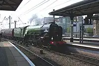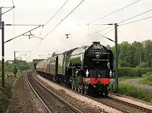 No public trains were rescheduled to create a special path for the charter train, however, the schedule planned in advance was crafted to avoid where possible being delayed by public trains.[1][6] Also, in a departure from normal main line steam operation railway practice, the train was, where necessary, given priority over normal train services. This was achieved by having a National Express East Coast executive on board, communicating by mobile phone and radio with signal boxes and train control centres.[2]