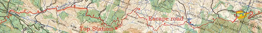 Tea chests arriving at Top Station from the Kundalai Valley were transported by a ropeway from Top Station 5 km downhill to the south to Kurangani, Tamil Nadu. The tea was then shipped 15 km by cart to Bodinayakkanur, then by rail to other places in India and by ship to England.[4] Remains of the ropeway station at Top Station are still visible.[6][7] The elevation at the top of the Bodi ropeway was 1,911 meters (6,270 ft).[8]