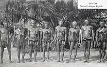Music and dance played important roles in Topoke culture, and music in particular reached a high level of sophistication.[4] The Topoke people had a long tradition of large regional markets, where purchases could be made on credit or by using iron javelins as currency. Non-payment of debts periodically led to fighting, in which the javelins were used as weapons.[5] The lances were called ndoa by some Topoke, the Lokele word for marriage. Thirty of them would buy a male slave, while forty or more would be needed for a female.[6] The Topoke were polygynous, and it was common for an important visitor to be offered female companionship as well as food and shelter. This practice persisted well into the colonial era.[7] However, sometimes sexual abuse of Topoke women by colonial administrators led to retaliation such as poisoning attempts by their husbands.[8]