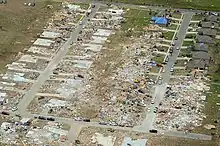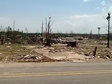 The tornado entered Faulkner County and struck the River Plantation subdivision at the southwest edge of Mayflower. Here, EF4 damage took place with large, two-story homes being leveled with only piles of debris left on their foundations. On the northeast side of the subdivision, one person was killed after debris struck the door of her storm shelter and opened it, exposing her to the tornado. The storm shelter's door was found to have been of sub-standard construction. Near where this fatality took place, large concrete road barriers were blown over and moved, and calculations revealed that this was also likely indicative of EF4 intensity.[14][15] Just outside the subdivision, a power substation sustained major damage. Continuing northeast, the storm tore across the south edge of Mayflower and crossed AR 365 and I-40, tossing semi-trucks, cars, and road equipment from the highway. I-40 was closed for a time after the storm.[16] A business district in this area experienced mainly EF3 damage, with 18-wheelers tossed, industrial buildings damaged or destroyed, and some nearby homes heavily damaged. A recreational vehicle dealership on the other side of the highway was completely destroyed at EF4 intensity (though meteorologist/civil engineer Tim Marshall applied an EF3 rating at this location due to structural flaws), along with most of the RVs; three of which were found wrapped around a nearby billboard. A vehicle repair shop, millwork company, construction company, and church in southern Mayflower were also destroyed, and a home improvement store was badly damaged.[17] In addition to the fatality in the storm shelter, two other people were killed in Mayflower.[18] The tornado then crossed Lake Conway, downing numerous trees and causing a mixture of EF2 and EF3 damage to homes along the lakeshore. Some block-foundation frame homes along with multiple mobile homes were swept into the lake by the tornado. The Arkansas Game and Fish Commission lost a clubhouse, shop, horse barn, residence, metal carports, shower house, and several dog kennels in this area, and eventually removed 627 tons of tornado debris from the lake.[17] The tornado then caused mainly EF2 damage as it struck areas in and around Saltillo. Numerous homes, mobile homes, sheds, barns, trees, and a church were damaged or destroyed in the Saltillo area. Two homes near Saltillo had only interior walls left standing, with the damage to those homes rated EF3.[14]