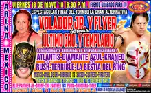The final Gran Alternativa tournament match was held on May 18 and was the only best two-out-of-three falls match of the tournament. The two teams split the first two falls between them, leading to the third and final fall where both team members had to be pinned to end the match. In the final moments of the match novato Flyer pinned veteran Último Guerrero after executing a Moonsault side slam off the rope, followed by Volador Jr. pinning Templario after rolling him up with a rana.[15][16] After the match was over Flyer and Volador Jr. were attacked by Los Ingobernables, Rush, El Terrible and La Bestia del Ring to continue an ongoing rivalry between Rush and Volador Jr. moments later Volador Jr,'s uncle L.A. Park and cousin El Hijo de L.A. Park made their surprise return to CMLL by running to the ring and chasing off Los Ingobernables.[15][16] After Flyer and Volador Jr. were given their Gran Alternativa tournament L.A. Park made a challenge to Rush for a Lucha de Apuestas match.[15][16]