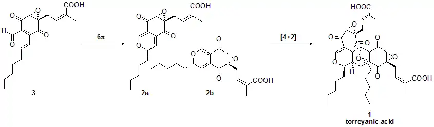 - 1 2 3 4 Li C, Johnson RP, Porco JA (April 2003). "Total synthesis of the quinone epoxide dimer (+)-torreyanic acid: application of a biomimetic oxidation/electrocyclization/Diels-Alder dimerization cascade". Journal of the American Chemical Society. 125 (17): 5095–106. doi:10.1021/ja021396c. PMID 12708860.