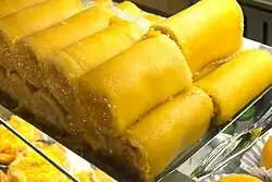 Although not considered a conventual sweet, it shares many of its egg-rich characteristics.[10] Notably, the sponge cake is made with maize flour instead of wheat flour.[1] A similar roll cake made of wheat flour and filled with doces de ovos is found in Viana do Castelo known as torta de Viana is classified as a conventual sweet.[11]