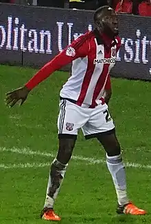 Diagouraga signed for Brentford on a three-year contract in July 2010.[33] He began the 2010–11 season as a starting central midfielder alongside Marcus Bean and featured in Brentford's run to the fourth round of the League Cup, in which he started in victories over Championship club Hull City and Premier League Everton in the second and third rounds respectively.[37] Diagouraga scored his first Brentford goal in a 2–1 home win over Charlton Athletic on 2 October.[38] Two games later, he found himself dropped to the bench and did not return to a regular starting role until teammate Nicky Forster replaced Andy Scott as manager in February 2011.[37] With the Bees, Diagouraga reached the first cup final of his career, but ended up on the losing club and was sent off for two bookable offences in a 1–0 defeat to Carlisle United in the 2011 Football League Trophy Final at Wembley Stadium.[39] He made 43 appearances during the 2010–11 season and scored one goal.[38]