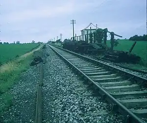 Parliamentary authorisation for the extension of the Wycombe Railway's single track line beyond Princes Risborough to Oxford was given on 28 June 1861.[4] Thame was reached by 31 July 1862, and a regular service from Paddington via Maidenhead began the next day.[5] By 1933, passenger numbers were dropping as a result of increased bus competition which led the Great Western Railway to introduce railmotors as an economy measure between Princes Risborough and Thame.[6] A wooden halt was also opened to the south of the small village of Towersey on the up side of an embankment on the western side of a level crossing spanning the Thame - Towersey - Chinnor road.[7] No more than 100 feet (30 m) long, the halt was supervised by the station master at Thame.[8] As with similar GWR structures, Towersey Halt had very basic facilities: a small wooden pagoda-style passenger waiting shelter, two oil lamps and a running in board showing the station's name on both sides.[9] To the east of the halt, Penn Farm had its own siding from the line's opening until 1939.[10]