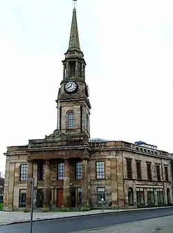 The new building was designed by David Hamilton in the neoclassical style, built in ashlar stone at a cost of £12,000 and was completed in December 1816.[2][5][6] The design involved a symmetrical main frontage with five bays facing northwest along Fore Street; the central section of three bays featured a full-height tetrastyle portico with Doric order columns supporting an entablature and a central roundel which was flanked by volutes and contained the town's coat of arms.[2] The outer bays were fenestrated with sash windows and flanked by full-height pilasters supporting an entablature and a balustrade.[2] At roof level, there was a central three stage tower, with round headed windows and Ionic order columns in the first stage, an octagonal piece with clock faces in the second stage and a belfry in the third stage.[2] The tower was surmounted by a spire, which was 150 feet (46 m) high, and a weather vane.[2] Internally, the principal room was the council chamber, which had a coffered and vaulted ceiling; the building also contained courtrooms and a series of prison cells.[2]