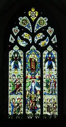 An organ, possibly by John Lincoln, was installed in 1811.[4] In 1874 the organ was under repair by Joseph Robson of London.[11] Despite this the organ was reconstructed by Maley, Young and Oldknow and reopened in 1877[12] and comprised 3 manuals and pedals with 21 speaking stops and a spare slide on the Swell. During this reconstruction it was moved to the north side of the choir from the old organ loft which was then demolished. The trumpet stop was replaced with another by Mr Oldknow in 1887.[13] Three stops were added to the swell in 1888[14] and he also added a 16 ft pedal reed in 1895[15]