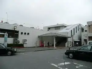 The station consists of two ground-level opposing side platforms serving two tracks, with an elevated station building above.
