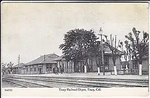 Tracy was a railway station in Tracy, California. When Southern Pacific built their new railway line around Suisun Bay in September 1878, the connection was made at a point three miles east of Ellis – the junction and town built around it were named Tracy.[1][2] The West Side Line was built from here, with service starting in 1892.[3] Southern Pacific moved their operational headquarters to Tracy from Lathrop in 1894.[4]