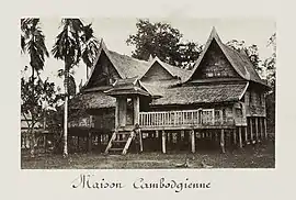 The earliest record of Cambodian housing is from the Chinese record of Funan kingdom (1st-7th century AD) where the residents were described as people who lived on stilt houses, cultivated rice and sent tributes of gold, silver, ivory and exotic animals.[2] The people built their houses over the ground and made them accessible by ladders as seen across Cambodia today. The Chinese accounts also mentioned the walled towns, dwelling houses and palaces.[3]