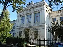 A permanent building, designed by Alexandru Săvulescu, was approved in 1890. Prime Minister Gheorghe Manu attended the groundbreaking, alongside Bogdan Petriceicu Hasdeu, sent by the Education Ministry. Construction proceeded quickly, with the final touches made in late 1891. An attempt to rename the school after Neagoe Basarab was soon dropped.[4] Theodor Costescu, who arrived in 1892, is considered the key figure in the school's early years.[3] He was responsible for introducing a uniform in 1893 and opening a library in 1896. He also designed a garden with flowers and bushes brought from the Mühle House in Timișoara, Austria-Hungary; this was completed in 1899.[5] He was dismissed as principal later that year after a change in government.[6] King Carol I visited in 1897.[5]